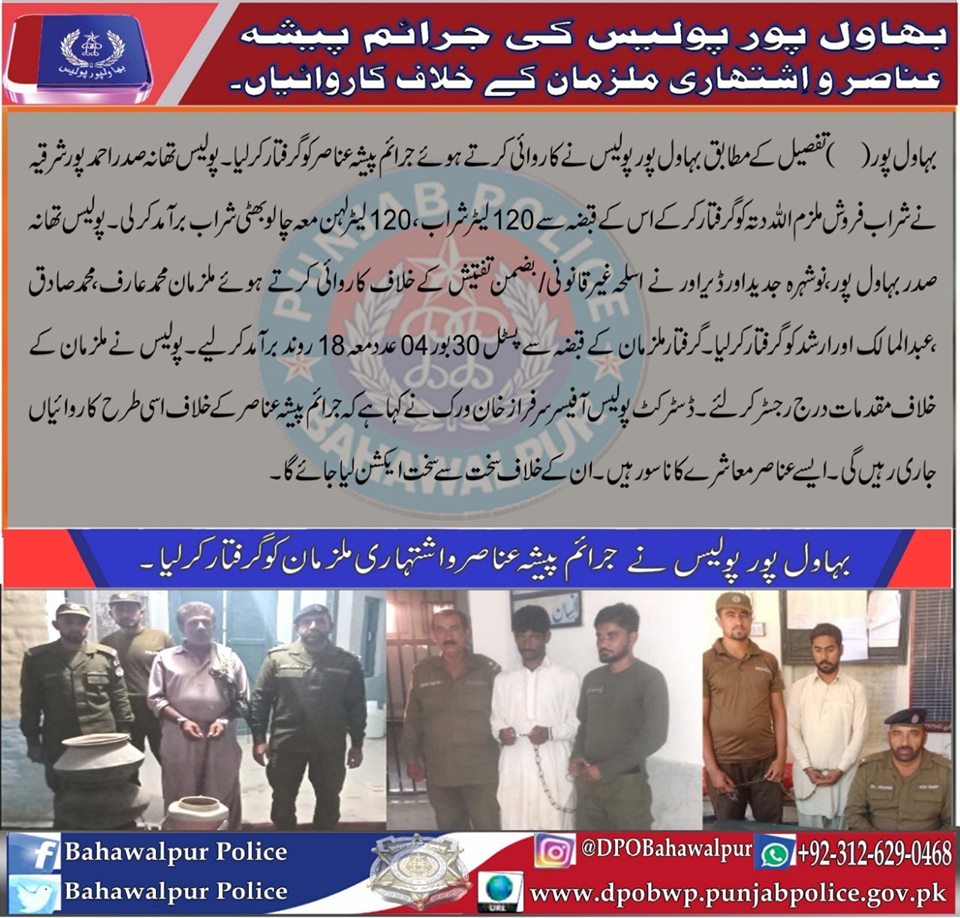 بہاولپور پولیس کی جرائم پیشہ عناصر کے خلاف کاروائیاں جاری ،ملزمان گرفتار ،مقدمات درج