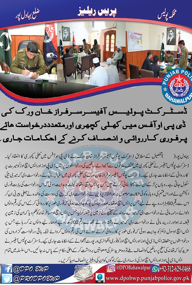 ڈسٹرکٹ پولیس آفیسر سرفراز خان وِرک کا ڈی پی او آفس میں کھلی کہچری کا انعقاد ، کھلی کہچری میں مختلف علاقوں سے آنے والے سائلین کی درخواستوں پر ایس ڈی پی اوز اور ایس ایچ اوز کو میرٹ پر کاروائی کے احکامات جاری