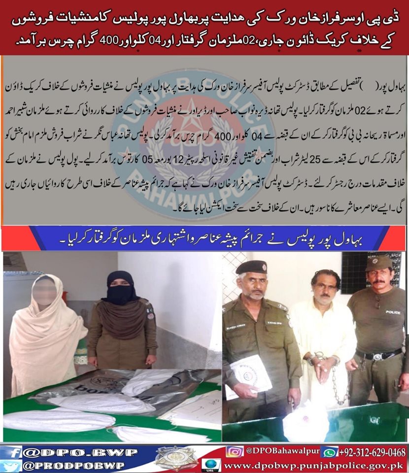ڈسٹرکٹ پولیس آفیسر سرفراز خان ورک کی ہدایت پر بہاولپور پولیس منشيات فروشوں کے خلاف کری ڈاؤن جاری،02 ملزمان گرفتار،مقدمات اندراج ۔