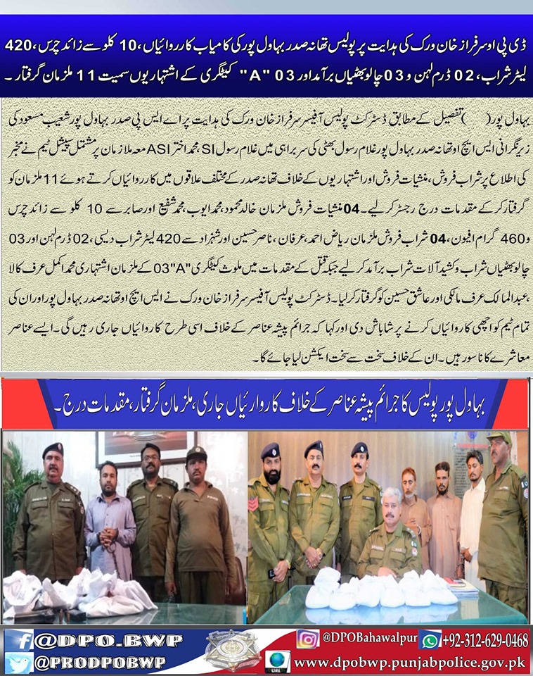 ڈسٹرکٹ پولیس آفیسر سرفراز خان ورک کی کی ہدایت پر بہاولپور پولیس تھانہ صدربہاولپور کی منشيات فروشوں کےخلاف کامیاب کاروائیاں جاری،10کلو سے زائد چرس 420لیٹر، شراب ،2ڈرم لہن ،3 چالو بھٹیاں برآمد اور 03 اے کیٹگیری کےاشتہاریوں سمییت 11ملزمان گرفتار ،مقدمات درج