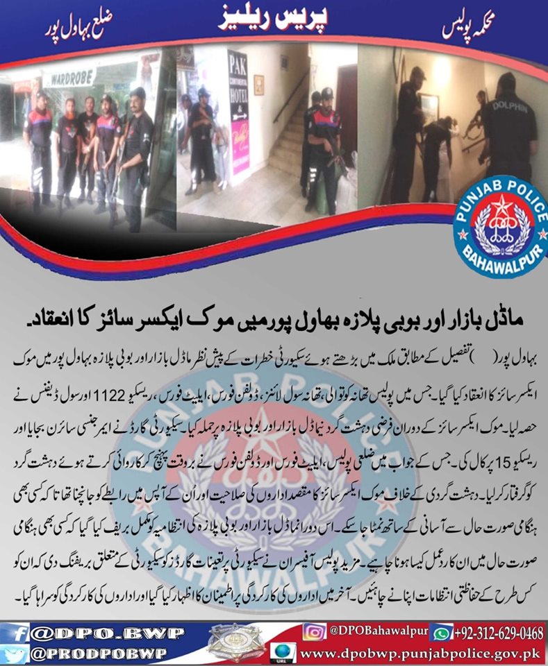 ملک میں سکیورٹی خطرات کے پیش نظر بہاولپور پولیس کا ماڈل بازار بہاولپور اور بوبی پلازہ بہاولپور پر موک ایکسرسائز کا انعقاد ۔
