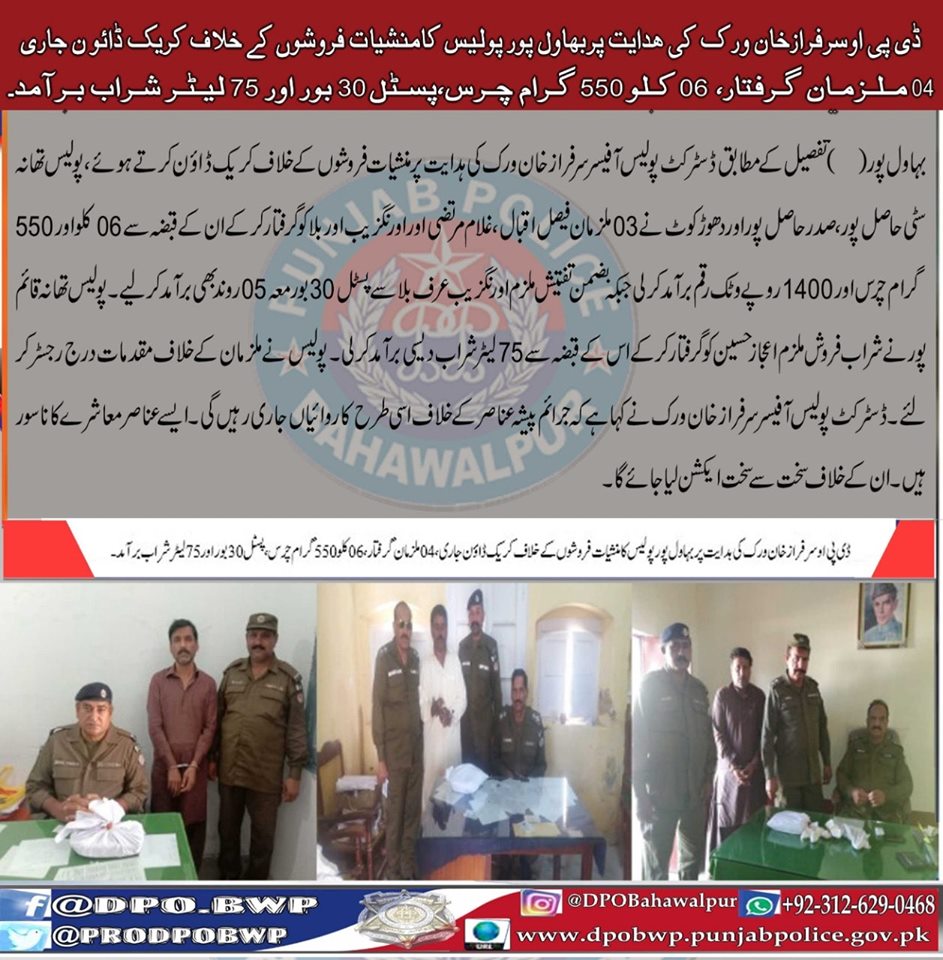 ڈسٹرکٹ پولیس آفیسر سرفراز خان ورک کی ہدایت پر بہاولپور پولیس منشيات فروشوں کے خلاف کری ڈاؤن جاری،04 ملزمان گرفتار،مقدمات اندراج ۔