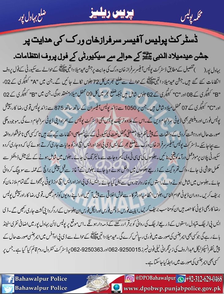 ڈسٹرکٹ پولیس آفیسر سرفراز خان ورک کی ہدایت پر جشن عید میلاد النبی ﷺ کے حوالے سے سکیورٹی کے فول پروف انتظامات