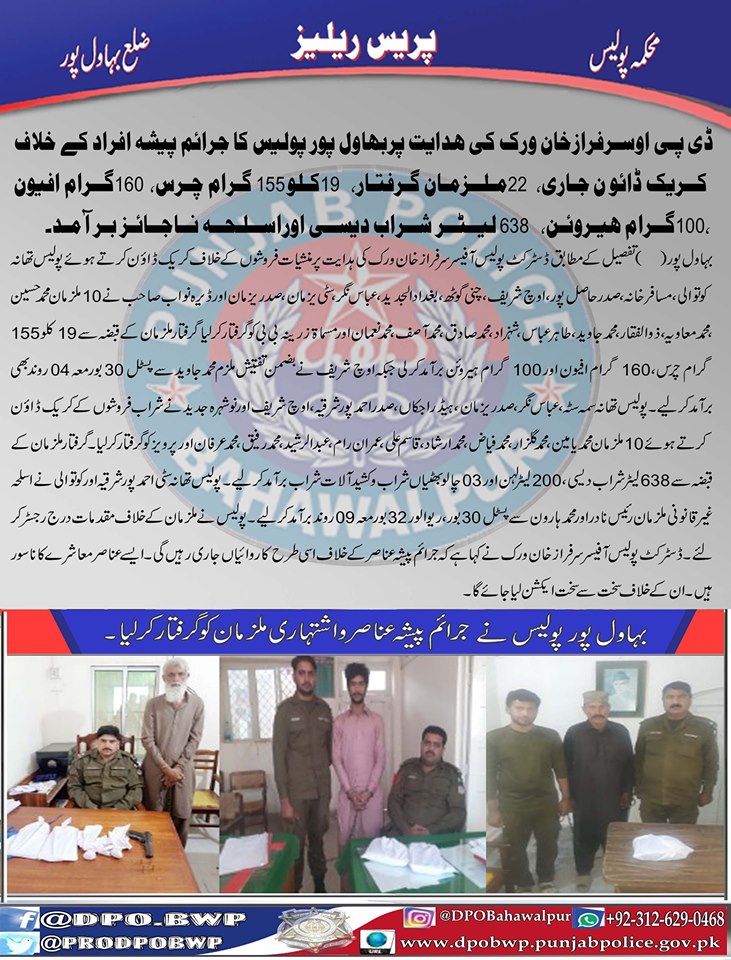 ڈسٹرکٹ پولیس آفیسر سرفراز خان ورک کی ہدایت پر بہاولپور پولیس منشيات فروشوں کے خلاف کری ڈاؤن جاری،22 ملزمان گرفتار،مقدمات اندراج ۔