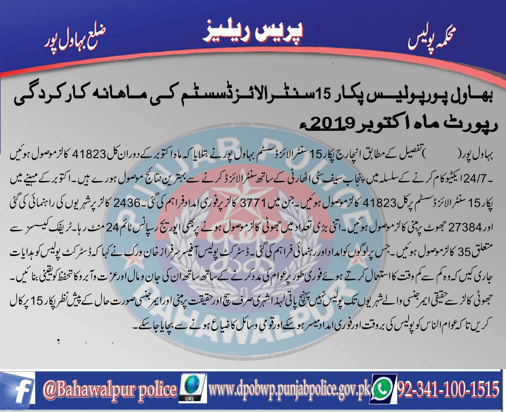 ڈسٹرکٹ پولیس پُکار 15 سنٹرلائزڈ سسٹم کی ماہانہ کارردگی پورٹ
