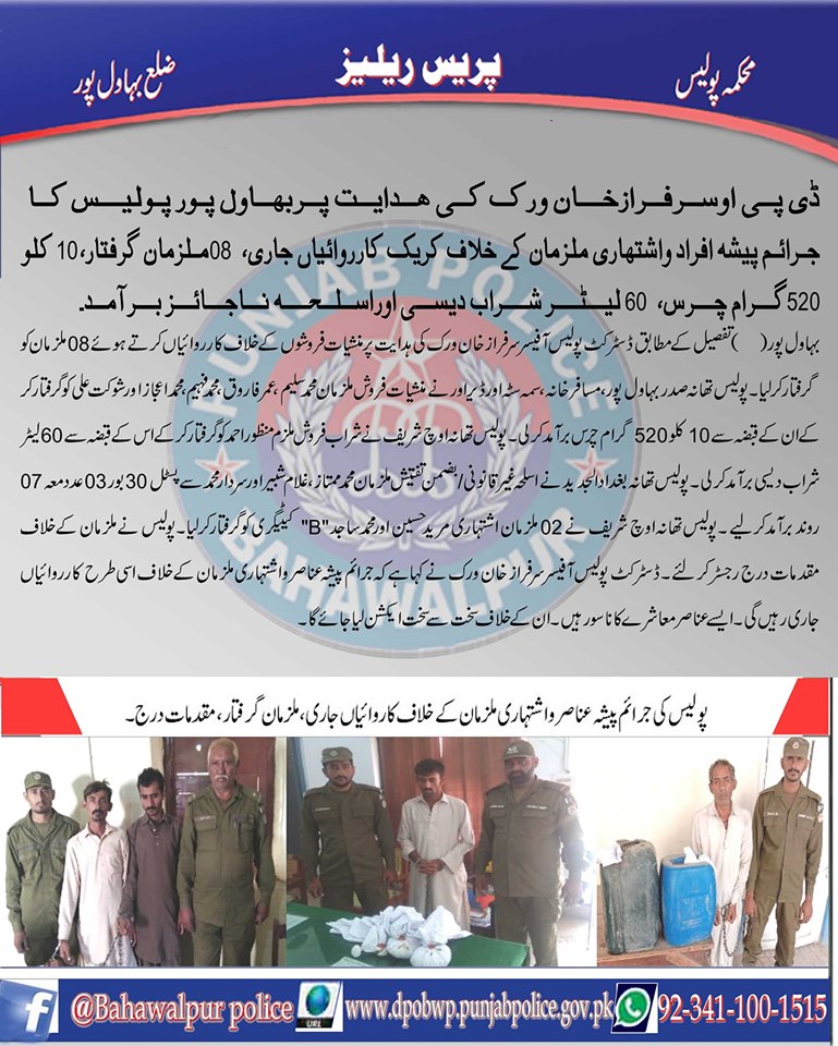 ڈسٹرکٹ پولیس آفیسر سرفراز خان ورک کی ہدایت پر بہاولپور پولیس منشيات فروشوں کے خلاف کریک ڈاؤن جاری،08 ملزمان گرفتار،مقدمات اندراج ۔