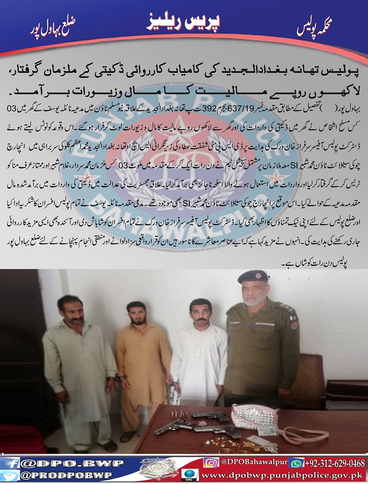 پولیس تھانہ بغداد الجدید کی کامیاب کاروائی،ڈکیتی کے ملزمان گرفتار،لاکھوں روپے مالیت کا مال وزیورات برآمد