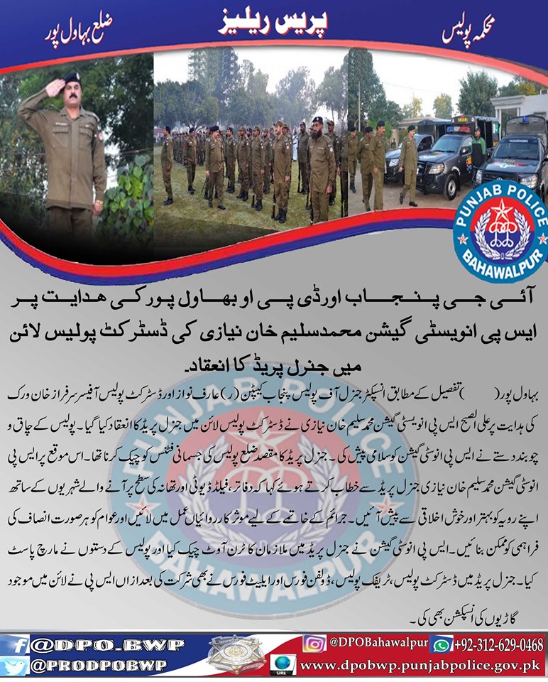 انسپکٹر جنرل پنجاب کیپٹن(ریٹائرڈ )عارف نواز کی ہدایت اور ڈسٹرکٹ پولیس آفیسر سرفراز خان ورک کی ہدایت پر ایس پی انوسٹی گیشن محمد سلیم خان نیازی کی ڈسٹرکٹ پولیس لائن میں جنرل پریڈ کا انعقاد ۔