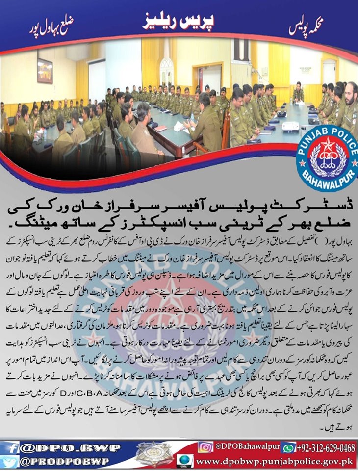 ڈسٹرکٹ پولیس آفیسر سرفراز خان ورک کی ضلع بھر کےٹرینی سب انسپکٹرز کے ساتھ میٹنگ