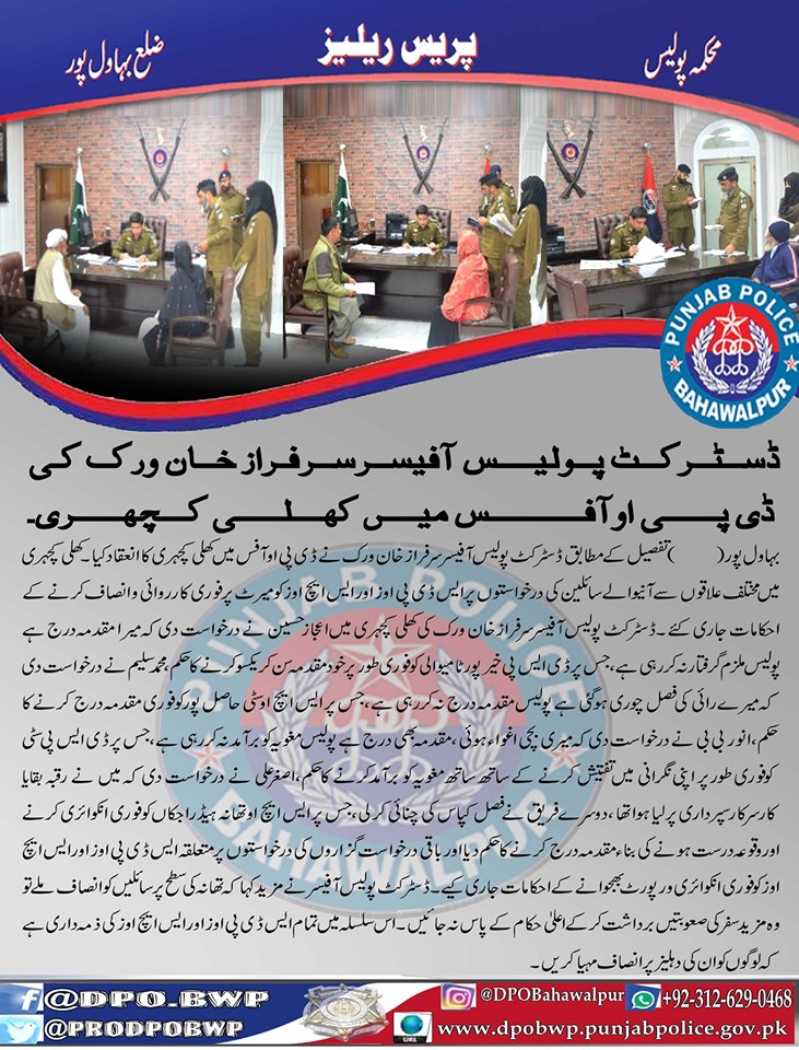 ڈسٹرکٹ پولیس آفیسر سرفراز خان ورک کی ڈی پی او آفس میں کھلی کچہری کاانعقاد،ایس ڈی پی اوز اور ایس ایچ اوزکومیرٹ پرکاروائی کےاحکامات جاری