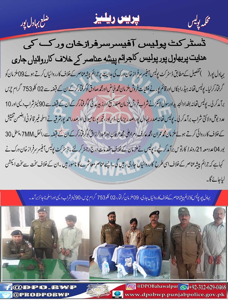 ڈسٹرکٹ پولیس آفیسر سرفراز خان ورک کی ہدایت پر بہاولپور پولیس منشيات فروشوں کے خلاف کری ڈاؤن جاری،09 ملزمان گرفتار،مقدمات درج ۔