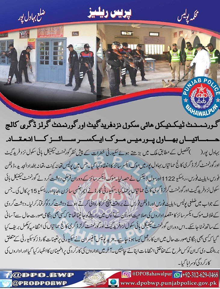 ملک میں سکیورٹی خطرات کے پیش نظر بہاولپور پولیس کا ٹیکنیکل ھائی اسکول نزد فرید گیٹ بہاولپور اور گورنمنٹ گرلز ڈگری کالج حمائتیاں بہاولپور پر موک ایکسرسائز کا انعقاد ۔