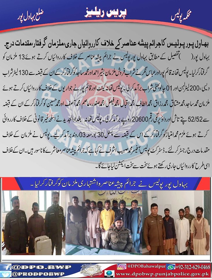 ڈسٹرکٹ پولیس آفیسر محمد صہیب اشرف کی ہدایت پر بہاولپور پولیس منشيات فروشوں اور اشتہاری ملزمان کے خلاف کری ڈاؤن جاری,13 ملزمان گرفتار،مقدمات درج ۔