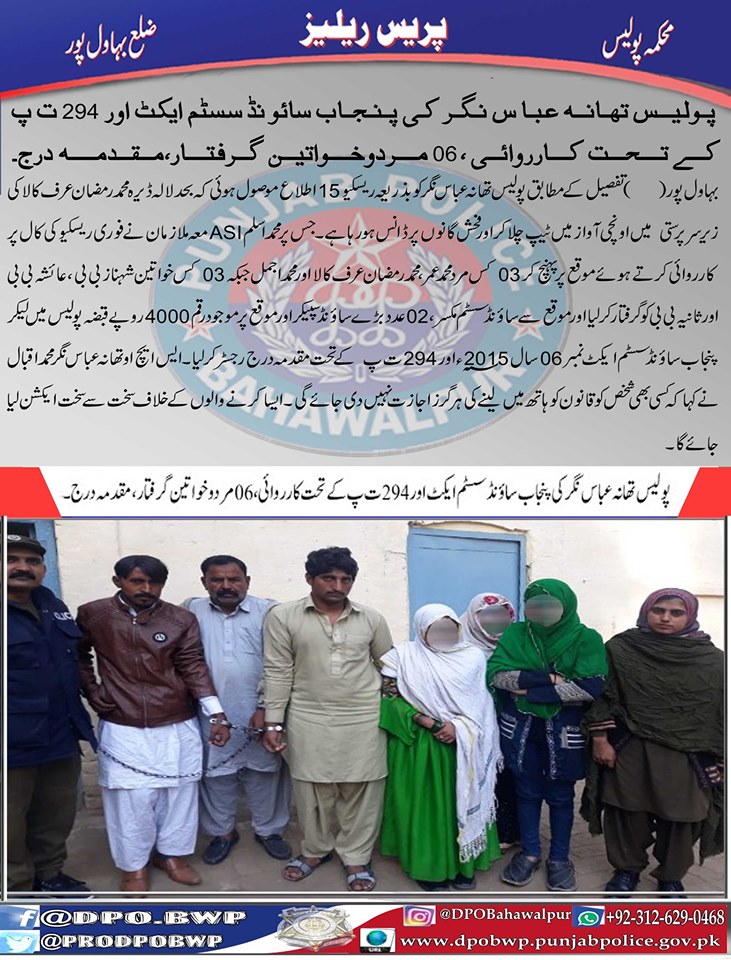 پولیس تھانہ عباسنگر کی پنجاب ساؤنڈ سسٹم ایکٹ اور 294 ت پ کے تحت کاروائی ، 06 مرد و خواتین گرفتار مقدمہ درج۔
