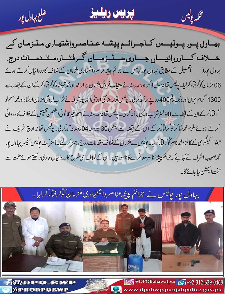 ڈسٹرکٹ پولیس آفیسر محمد صہیب اشرف کی ہدایت پر بہاولپور پولیس منشيات فروشوں اور اشتہاری ملزمان کے خلاف کری ڈاؤن جاری,06 ملزمان گرفتار،مقدمات درج ۔