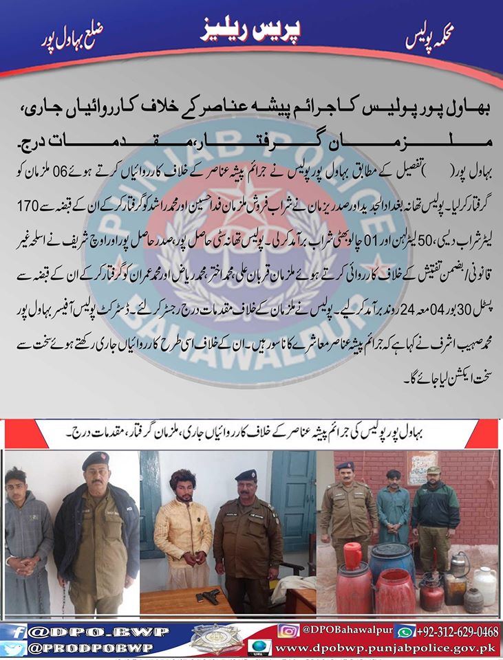 ڈسٹرکٹ پولیس آفیسر بہاولپور محمد صہیب اشرف کی ہدایت پر بہاولپور پولیس کا ضلع بھر کے مختلف تھانوں میں منشيات فروشوں کے خلاف کاروائیاں جاری،ملزمان گرفتار،مقدمات درج۔