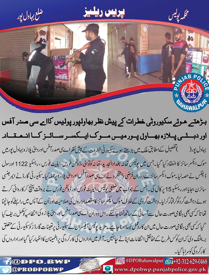 ملک میں سکیورٹی خطرات کے پیش نظر بہاولپور پولیس کا اے سی صدر دفتر بہاولپور اور دبئی پلازہ بہاولپور پر موک ایکسرسائز کا انعقاد ۔