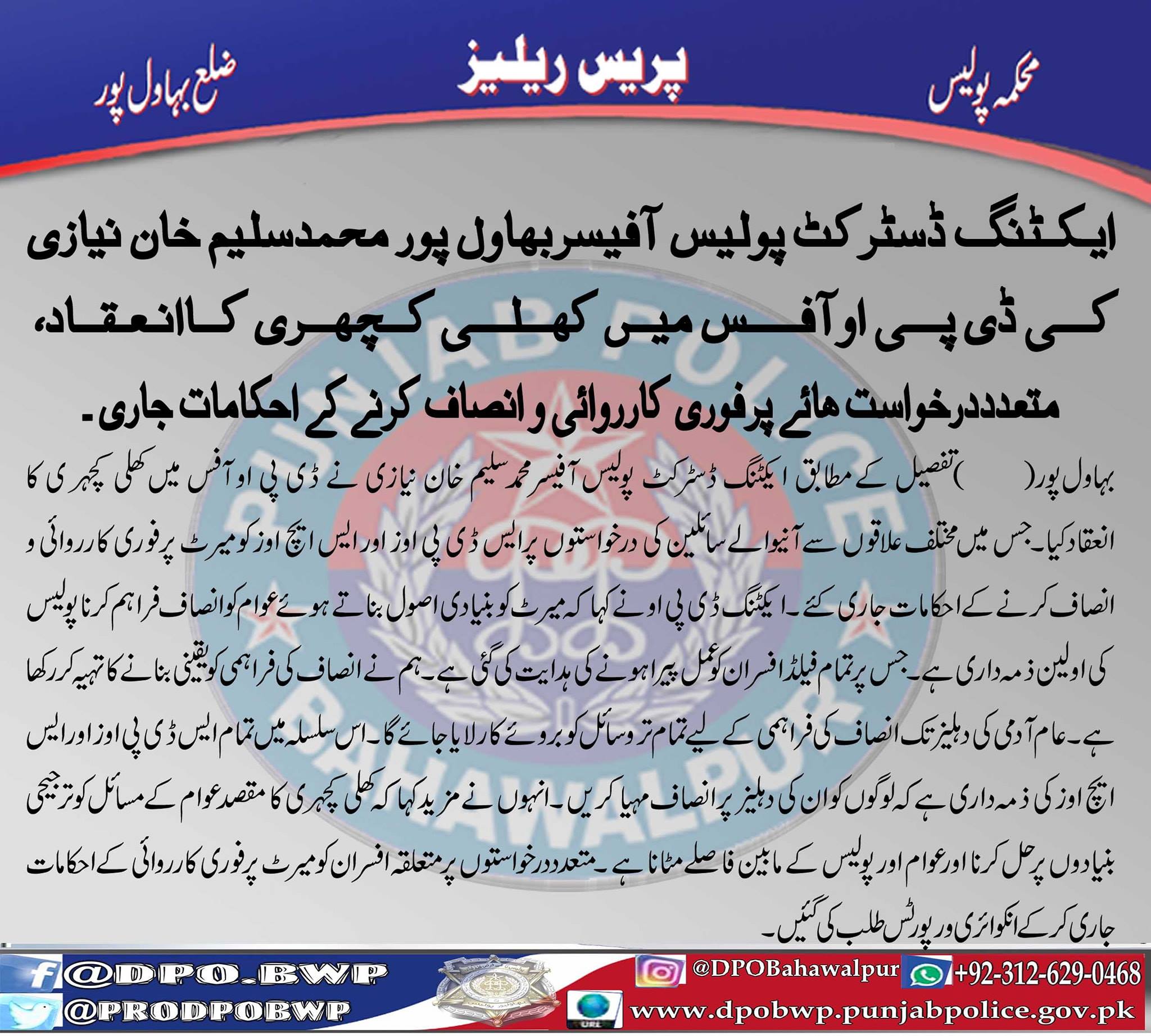 ایکٹنگ ڈسٹرکٹ پولیس آفیسر بہاولپور محمد سلیم خان نیازی کی ڈی پی او آفس میں کھلی کچہری کا انعقاد ، متعدد درخواست ہاۓ پر فوری کاروائی کے احکامات جاری۔