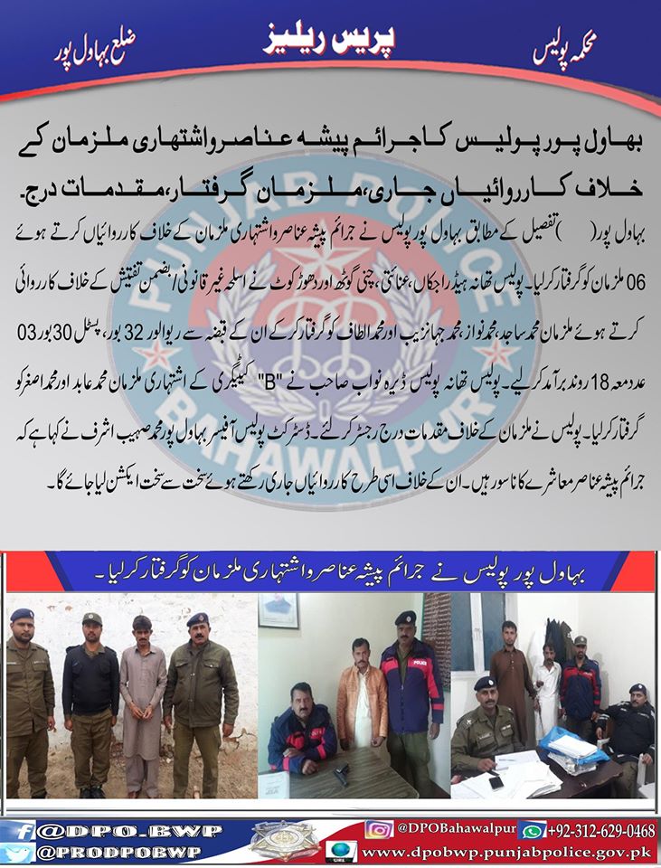 بہاولپور پولیس کاجرائم پیشہ عناصر و اشتہاری ملزمان کے خلاف کاروائیاں جاری، ملزمان گرفتار،مقدمات درج