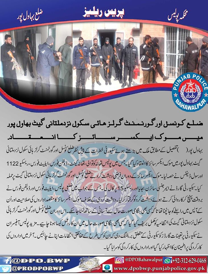 ملک میں سکیورٹی خطرات کے پیش نظر بہاولپور پولیس کا گورنمنٹ گرلز ہائی اسکول نزد ملتانی گیٹ بہاولپور اور دفتر ضلع کونسل بہاولپور پر موک ایکسرسائز کا انعقاد ۔