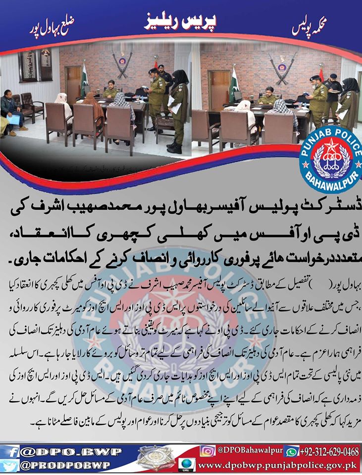 ڈسٹرکٹ پولیس آفیسر بہاولپور کی ڈی پی او آفس میں کھلی کچہری کا انعقاد ، متعدد درخواست ہاۓ پر فوری کاروائی کے احکامات جاری۔