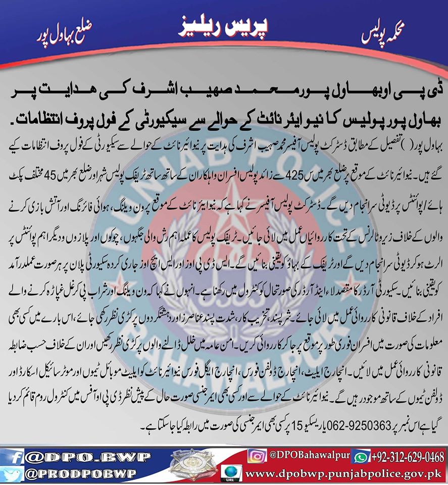 ڈسٹرکٹ پولیس آفیسر بہاولپور محمد صہیب اشرف کی ہدایت پر بہاولپور پولیس کا نیوائیر نائٹ کے حوالے سے سکیورٹی کے فول پروف انتظامات ۔