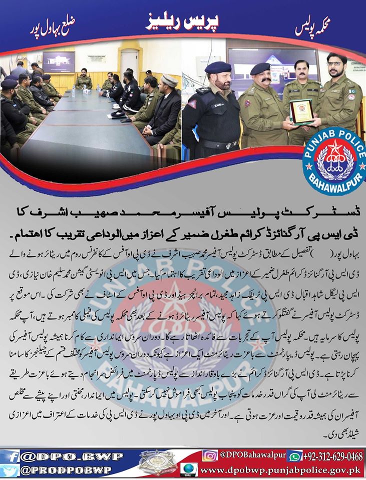 ڈسٹرکٹ پولیس آفیسر بہاولپور محمد صہیب اشرف کا ڈی ایس پی آرگنائزڈ کرائم طغرل ضمیر کے اعزاز میں الوداعی تقریب کا انعقاد