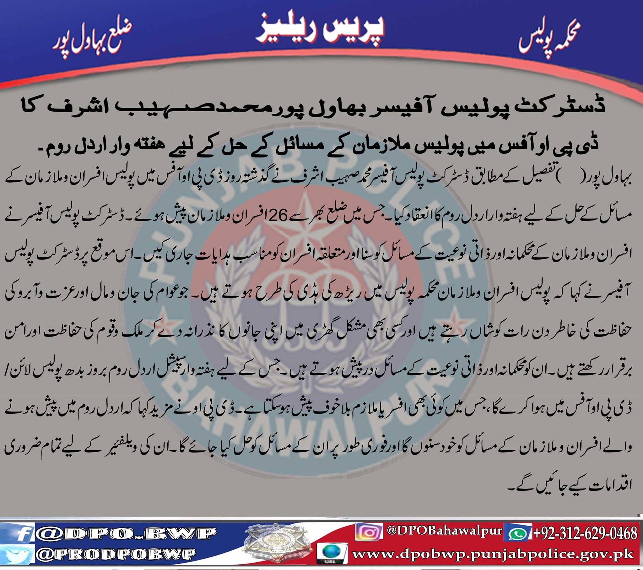 ڈسٹرکٹ پولیس آفیسر بہاولپور کا ڈی پی او آفس بہاولپور میں پولیس ملازمان کے مسائل کے حل کیلیے ہفتہ وار اردل روم ۔