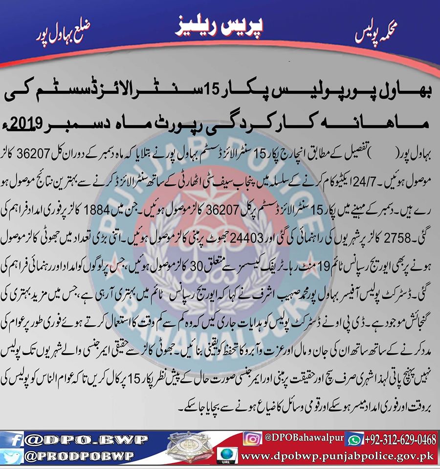 بہاولپور پولیس پکار 15سنٹرالائزڈ سسٹم کی ماہانہ کارکردگی رپورٹ جاری، ماہِ دسمبر 2019 میں کل36,207 کالز موصول ہوئیں