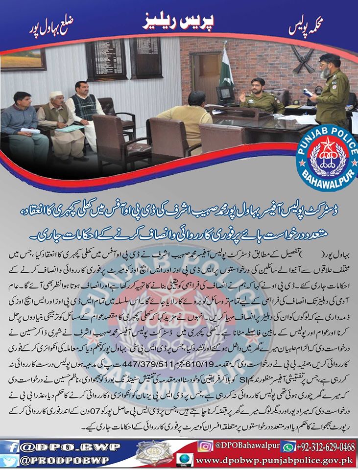 ڈسٹرکٹ پولیس آفیسر بہاولپور کی ڈی پی او آفس بہاولپور میں کھلی کچہری کا انعقاد ،متعدد درخواست ہاۓ پر فوری کاروائی کے احکامات جاری