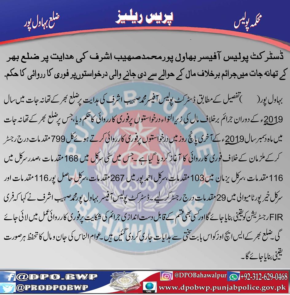 ڈسٹرکٹ پولیس آفیسر بہاولپور محمد صہیب اشرف کی ہدایت پر ضلع بھر کے تھانہ جات میں جرائم برخلاف مال کے حوالےسےدی جانےوالی درخواستوں پر فوری کاروائی کا حکم