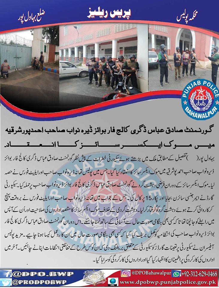ملک میں سکیورٹی خطرات کے پیش نظر بہاولپور پولیس کا گورنمنٹ صادق عباس ڈگری کالج فار بوائز ڈیرہ نواب صاحب احمدپورشرقیہ میں موک ایکسرسائز کا انعقاد ۔