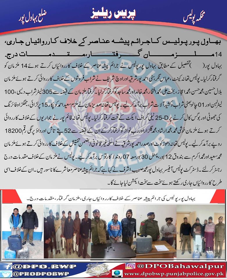 بہاولپور پولیس کا جرائم پیشہ عناصر کے خلاف کاروائیاں جاری ،14ملزمان گرفتار،مقدمات درج۔