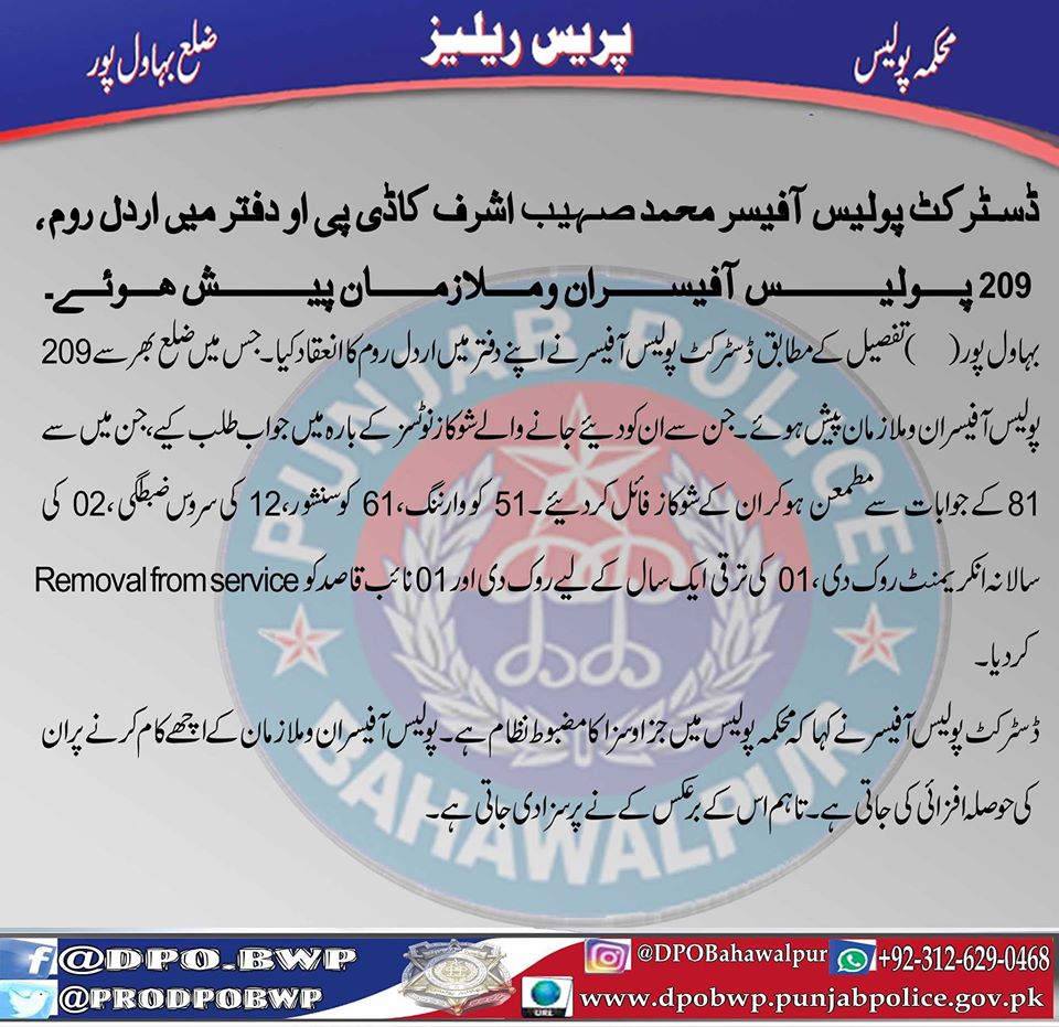 ڈسٹرکٹ پولیس آفیسر محمد صہیب اشرف کا ڈی پی او دفتر میں اردل روم ،209 پولیس آفسران و ملازمان پیش ہوۓ۔