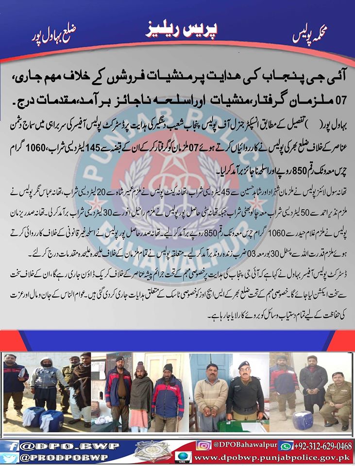 انسپکٹر جنرل پولیس پنجاب کی ہدایت پر منشيات فروشوں کے خلاف مہم جاری، مجرمان اشتہاریوں سمیت 07 ملزمان گرفتار، اسلحہ اور منشيات برآمد ،مقدمات درج۔