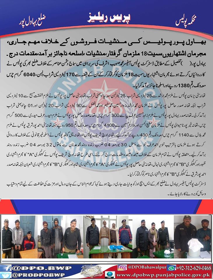 انسپکٹر جنرل پولیس پنجاب کی ہدایت پر منشيات فروشوں کے خلاف مہم جاری، مجرمان اشتہاریوں سمیت 18 ملزمان گرفتار، منشيات اور اسلحہ ناجائزبرآمد ،مقدمات درج۔