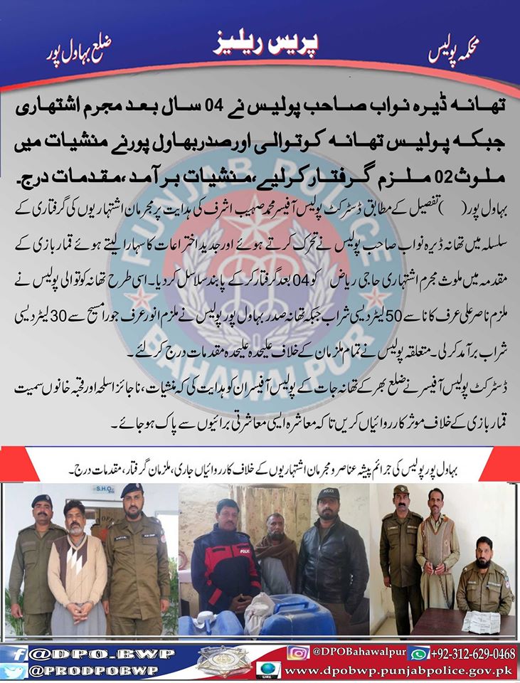 تھانہ ڈیرہ نواب صاحب نے 04 سال بعد مجرم اشتہاری جبکہ پولیس تھانہ کوتوالی اور صدربہاولپور نے منشيات میں ملوث 02 ملزمان گرفتار کرلیے، منشيات برآمد، مقدمات درج۔