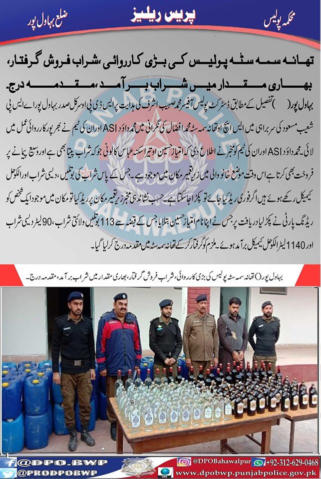 تھانہ سمہ سٹہ پولیس کی بڑی کاروائی شراب فروش گرفتار، شراب برآمد، مقدمہ درج۔
