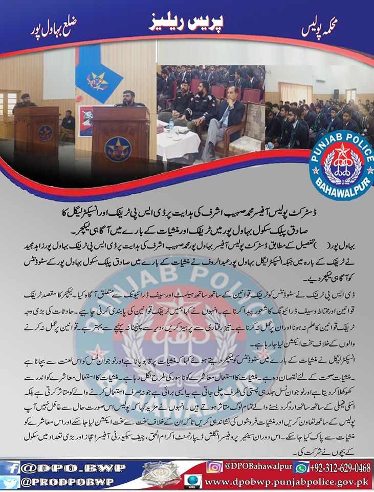 ڈسٹرکٹ پولیس آفیسر محمد صہیب اشرف کی ہدایت پر ڈی ایس پی ٹریفک اور انسپکٹر لیگل کا صادق پبلک اسکول بہاولپور میں ٹریفک اور منشیات کے بارے میں آگاہی لیکچر۔