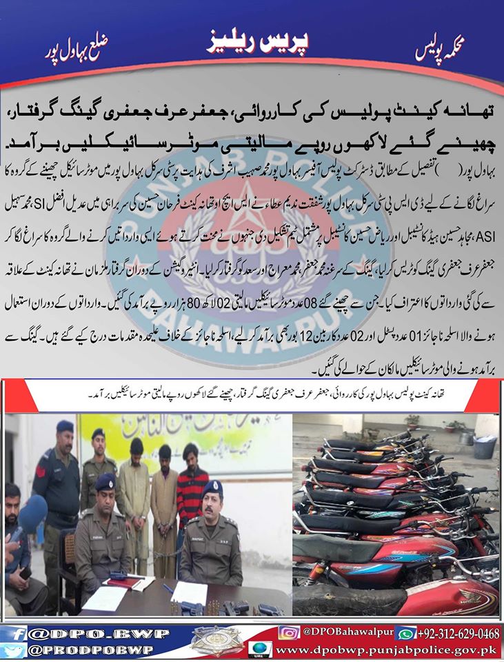 تھانہ کینٹ پولیس کی کارروائی ،جعفر عرف جعفری گینگ گرفتار،چھینے گئے لاکھوں روپے مالیتی موٹرسائیکلیں برآمد۔