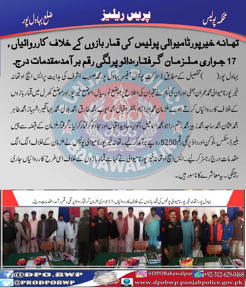 تھانہ خیرپور ٹامیوالی کی قمار بازوں کے خلاف کارروائیاں ،27 جواری گرفتار، داؤ پر لگی رقم برآمد، مقدمات درج۔