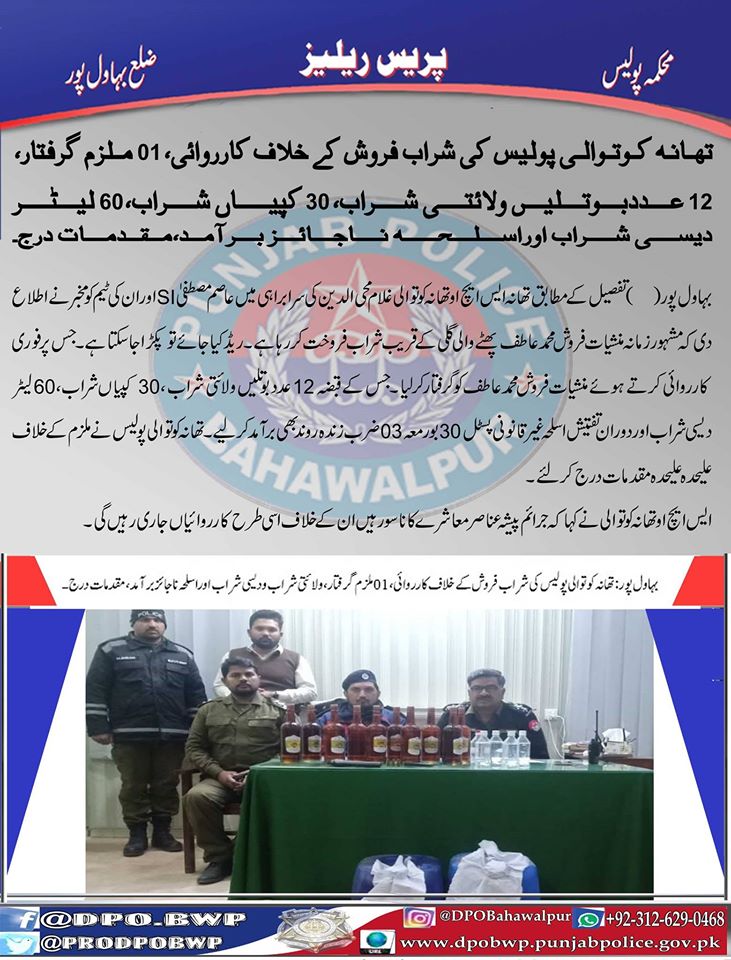 تھانہ کوتوالی پولیس کی شراب فروش کے خلاف کارروائی ،12عددولایتی بوتلیں شرب،30 کپیاں شراب ،60 لیٹردیسی شراب اور اسلحہ ناجائز برآمد، مقدمات درج۔