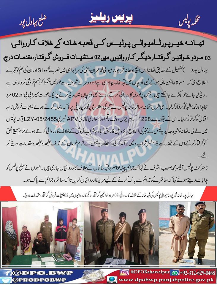 تھانہ خیرپور ٹامیوالی پولیس کی قحبہ خانہ کے خلاف کارروئی،03مرد و خواتین گرفتار، دیگر کارروائیوں میں 02منشیات فروش گرفتار، مقدمات درج۔