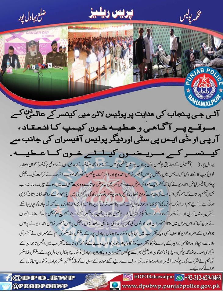 آئی جی پنجاب کی ہدایت پر پولیس لائن بہاولپور میں کینسر کے عالمی دن کے موقع پر آگاہی و عطیہ خون کیمپ کا انعقاد ،آر پی او بہاولپور ،ڈی ایس پی سٹی بہاولپور اور دیگر پولیس افسران کی جانب سے کینسر کے مریضوں کے لیے خون کا عطیہ۔