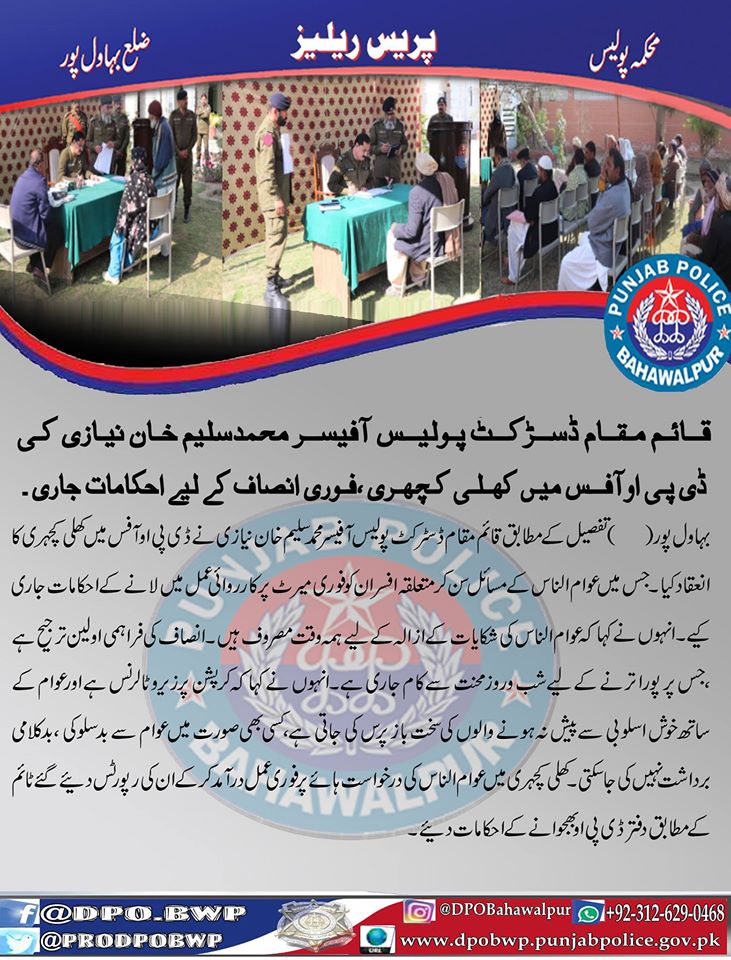قائم مقام ڈسٹرکٹ پولیس آفیسر محمد سلیم خان نیازی کی ڈی پی او آفس میں کھلی کچہری ،فوری انصاف کیلیے احکامات جاری۔