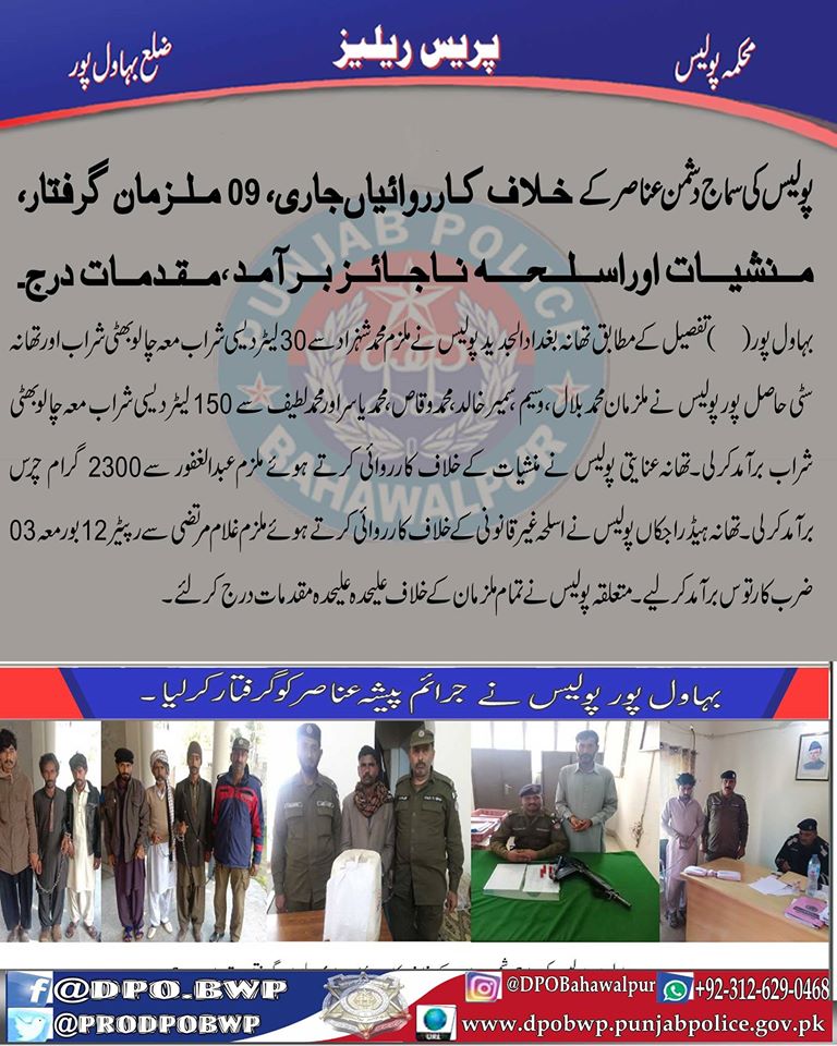 پولیس کی سماج دشمن عناصر کے خلاف کارروائیاں جاری، 09 ملزمان گرفتار منشيات اور اسلحہ ناجائز برآمد ،مقدمات درج ۔