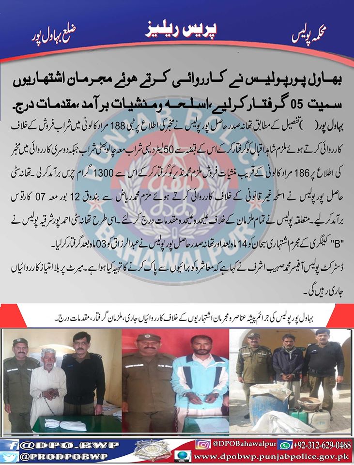 بہاولپور پولیس نے کارروائی کرتے ہوے، مجرمان اشتہاریوں سمیت 05 ملزمان گرفتار کرلیے،منشيات اور اسلحہ ناجائز برآمد ،مقدمات درج ۔