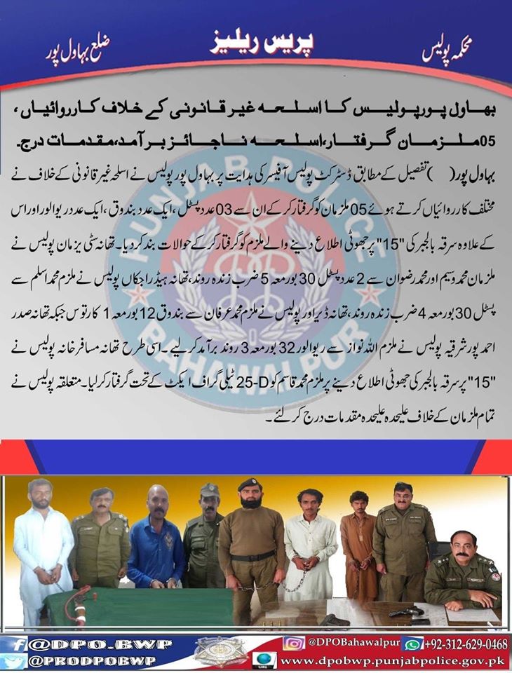 بہاولپور پولیس کا اسلحہ غیر قانونی کےخلاف کارروائیاں ،05 ملزمان گرفتار ،اسلحہ ناجائز برآمد ،مقدمات درج۔
