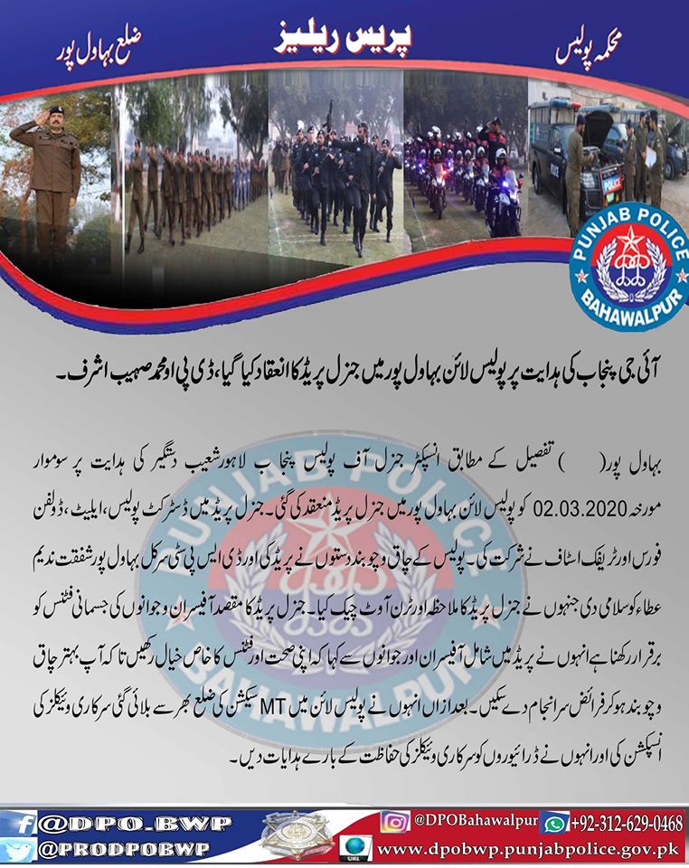 آئی جی پنجاب کی ہدایت پر پولیس لائن بہاولپور میں جنرل پریڈ کا انعقاد کیا گیا۔