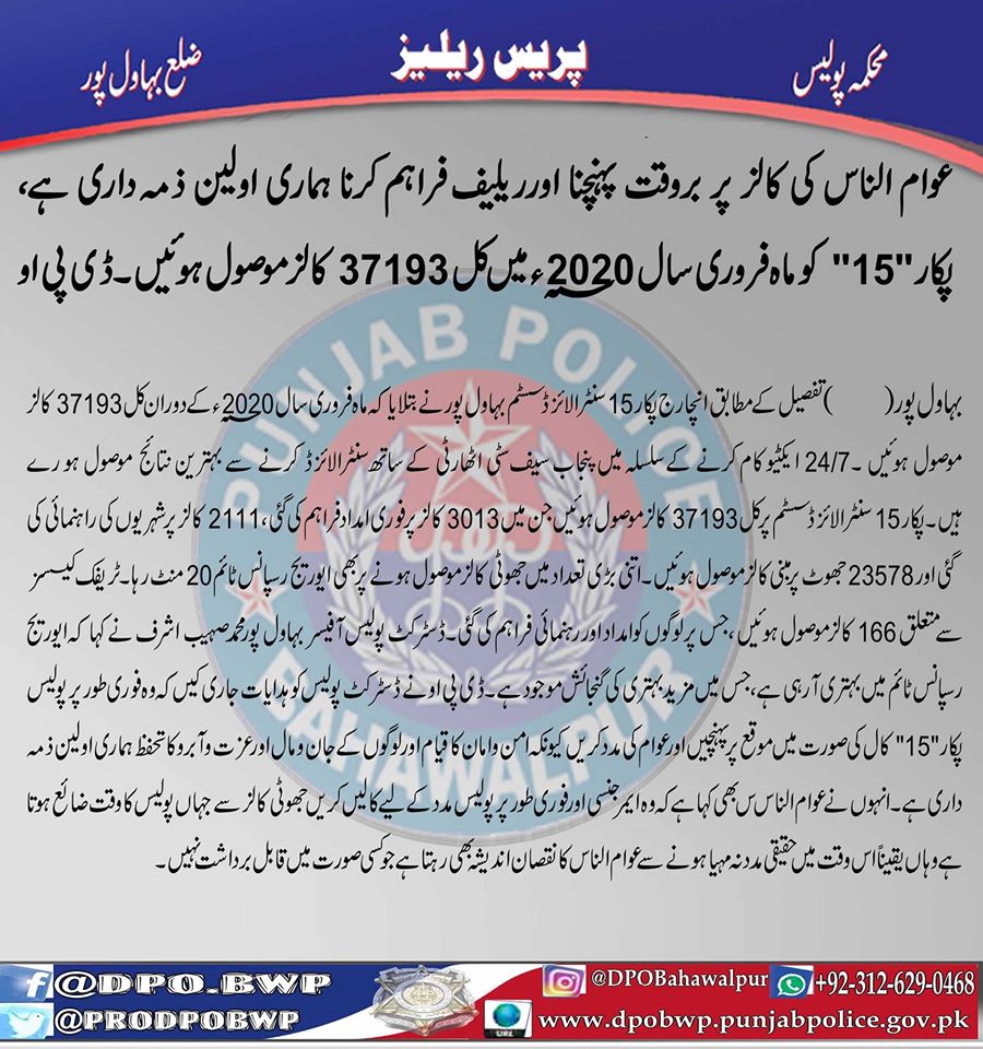 عوام الناس کی کالز پر بروقت پہنچنا اور ریلیف فراہم کرنا ہماری اولین ذمہ داری ہےـپکار 15 کو ماہ فروری سال 2020ء میں کل 38193 کالز موصول ہوئیں ۔ڈی پی او